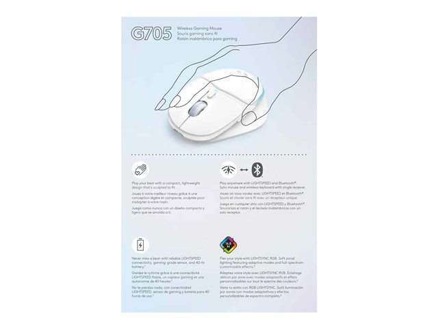 Logitech G G705 - Mus - små händer - 6 knappar - trådlös - Bluetooth - USB Logitech LIGHTSPEED-mottagare - vit