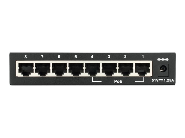 The D-Link DES-1008PA 8-Port Fast Ethernet PoE Desktop Switch enables both home and office users to easily connect and supply power to Power over Ethernet (PoE) devices such as wireless Access Points (APs), IP cameras, and IP phones while adding more Ethernet devices like computers, printers, and Network Attached Storage (NAS) onto a network. Built with home and small business users in mind, this compact PoE switch operates silently, making it ideal for use in virtually any room or office.