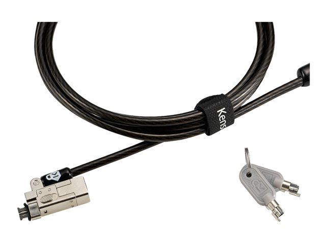 - 1,8 meter (6 fot) lång kolstålskabel står emot skärförsök. Ett skyddande hölje hjälper till att skydda fästpunkter som skrivbord och bord mot repor.